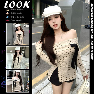 一字领波点长袖T恤女秋季蝴蝶结甜美修身显瘦开叉设计感露肩上衣