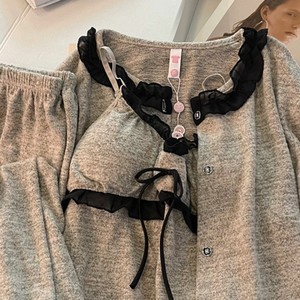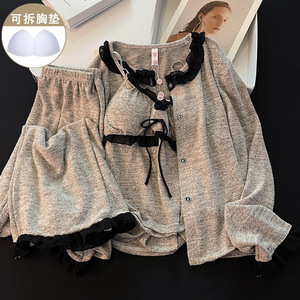 韩国爆款睡衣女秋冬季带胸垫吊带三件套2025年新款加厚纯棉家居服