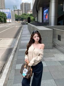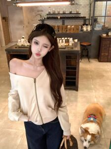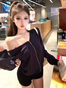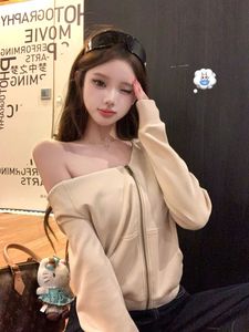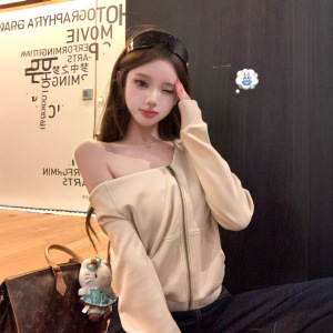 纯欲辣妹斜领露单肩设计感长袖开衫女薄款拉链卫衣外套百搭上衣潮