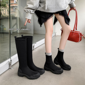 巨显瘦~2025新款运动厚底弹力瘦瘦靴高筒袜子靴百搭黑色长筒靴女