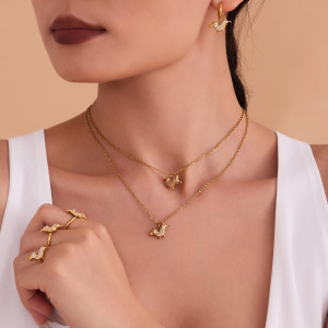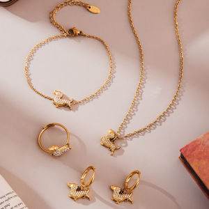 欧麦卡不锈钢满钻锆石小狗造型吊坠项链手链耳环戒指套装镀18k金