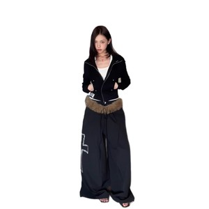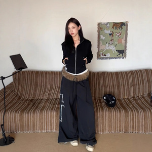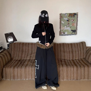 美式可拆卸毛领烫钻十字架阔腿休闲裤女宽松休闲辣妹风爵士弯刀裤