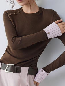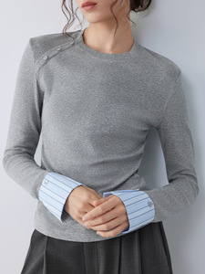 绵羊毛撞色正肩T恤女2025秋新款简约时尚设计感内搭休闲上衣