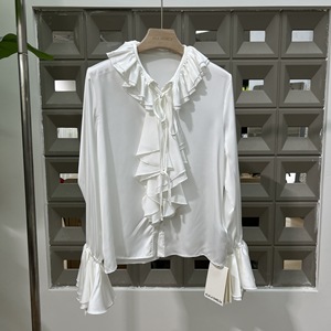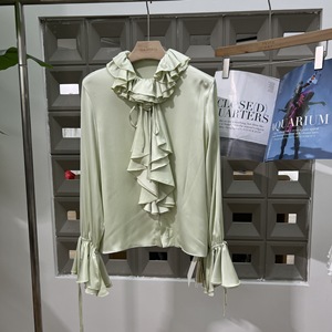 亚马逊春秋新款女装2025时尚减龄宽松纯色荷叶边缎面喇叭袖口衬衫
