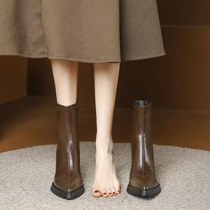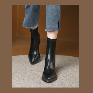 尖头短靴女今年流行新款粗跟高跟小个子增高法式瘦瘦靴弹力马丁靴