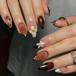 跨境欧美热销爆闪碎钻豹纹花朵水滴美甲纯手工杏仁型短款假指甲