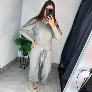 欧美跨境女装2025秋冬新款休闲长袖拉链针织外套系带阔腿长裤套装