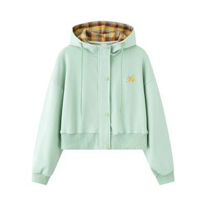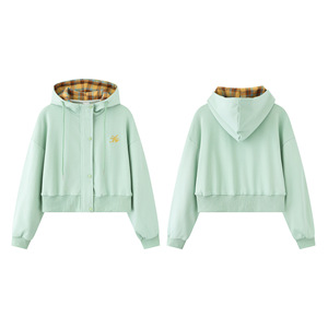 Fudge Pink 25秋季New甜美少女格纹拼接连帽卫衣外套