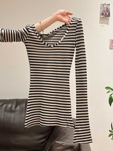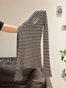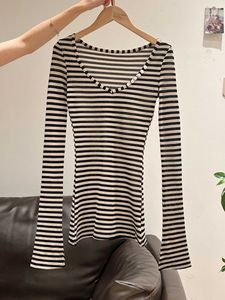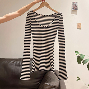 喇叭袖条纹撞色V领长袖t恤女2025秋季新款修身显瘦内搭打底衫上衣