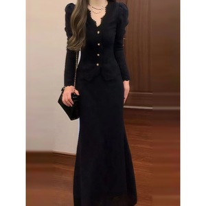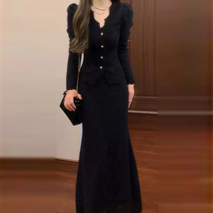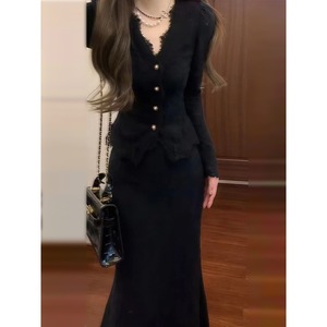 法式黑色针织连衣裙子女秋装2025新款小个子香风一整套早秋季穿搭