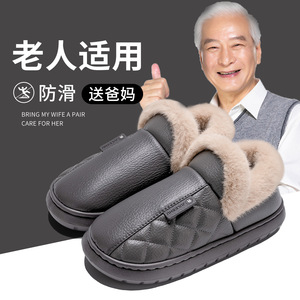 防水棉拖鞋家居秋冬女士厚底包脚后跟老人防滑保暖皮面棉鞋男外穿