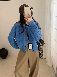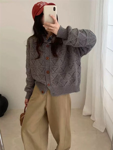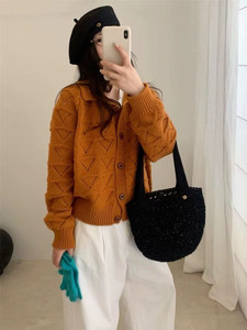 复古翻领镂空针织开衫女秋冬新款宽松慵懒百搭小个子短款毛衣外套