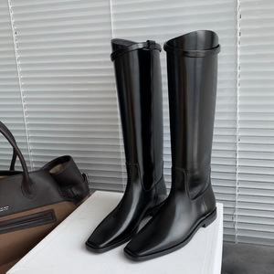 现货版~显瘦小方头真皮长筒靴女皮带扣平底长靴高筒骑士靴机车靴