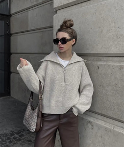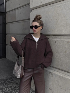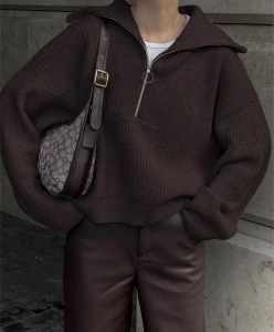 跨境亚马逊2025新款秋冬复古半拉链毛衣宽松休闲翻领针织套头衫女
