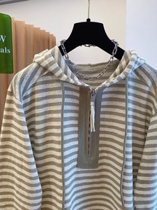 韩系连帽半拉链条纹t恤女长袖2025新款宽松休闲针织衫卫衣上衣秋