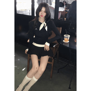 韩系学院风秋季新款假两件长袖t恤女减龄百褶短裙两件套