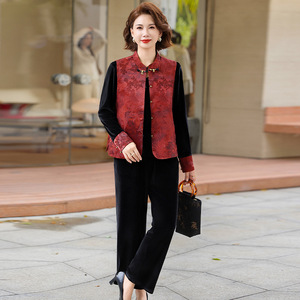 妈妈春秋新中式套装阔太太国风马甲上衣中老年女装气质丝绒三件套
