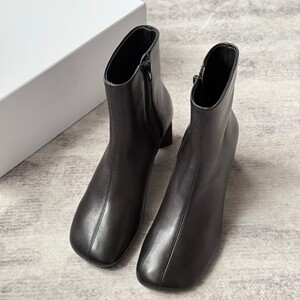 羊皮版简约复古高粗跟短靴女圆头韩系裸靴秋冬通勤及踝瘦瘦靴真皮