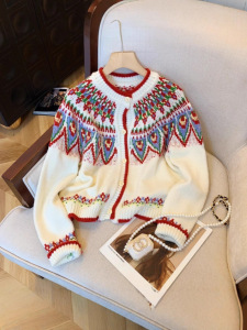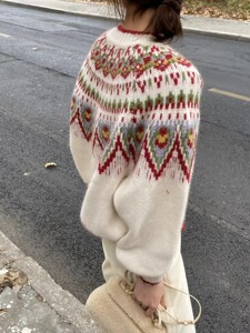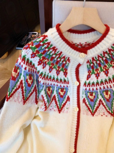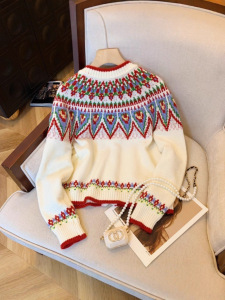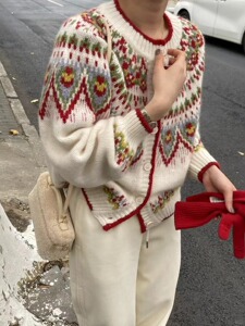优质圣诞节红色费尔岛毛衣女装慵懒风时尚宽松洋气减龄针织开衫上