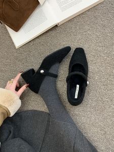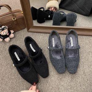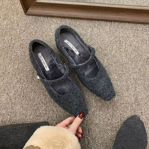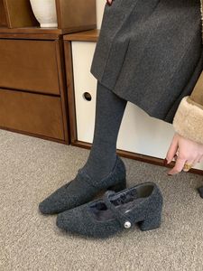 2025方头呢子灰色粗跟单鞋女冬季款法式气质加绒晚晚高跟玛丽珍鞋