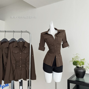 设计感收腰褶皱工装感弹力中长款可调节长袖polo衬衫女2025秋季