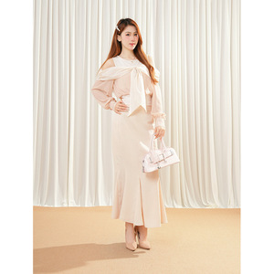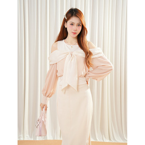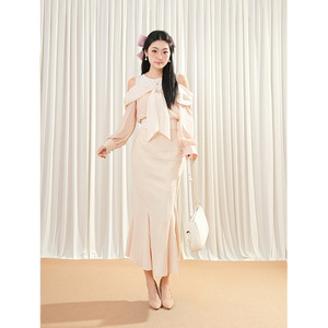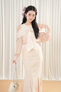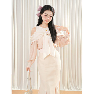 古着vintage清楚系两件套装蝴蝶结鱼尾日系长裙露肩显瘦25年新夏