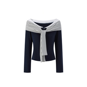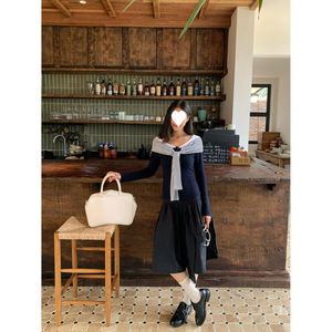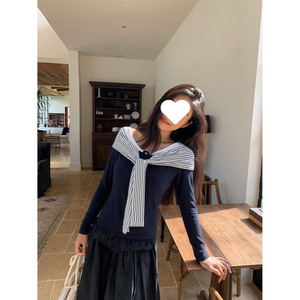 韩系假两件海军领条纹长袖t恤女秋季收腰显瘦设计感撞色打底上衣