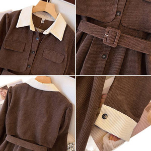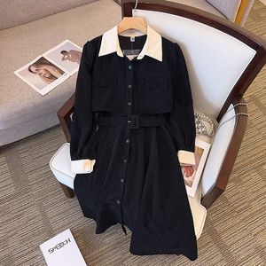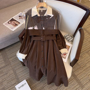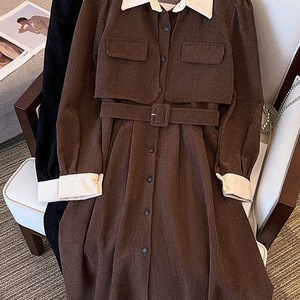 大码胖mm灯芯绒假两件撞色连衣裙2025秋季新款赫本风收腰显瘦裙子