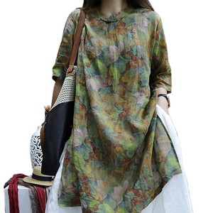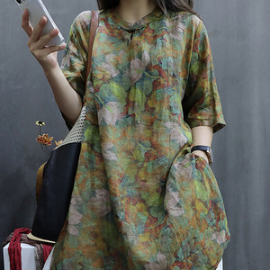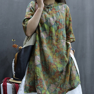 苎麻衬衫女印花茶服亚麻捡漏中长款短袖盘扣棉立领小衫上衣图片色