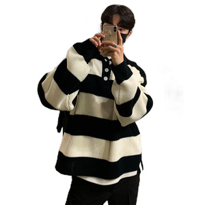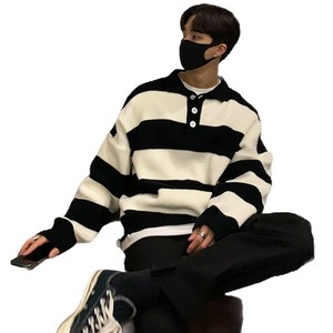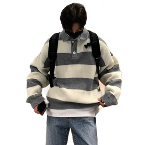 跨境爆款欧码大码POLO衫翻领条纹针织衫毛衣男宽松潮外套工厂批发