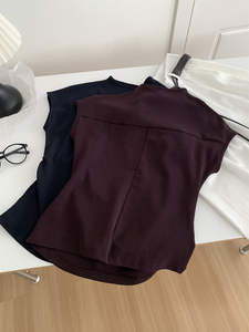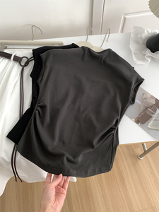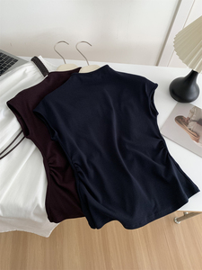 气质韩版修身显瘦飞袖T恤女设计感捏褶收腰短款立领早秋打底衫潮