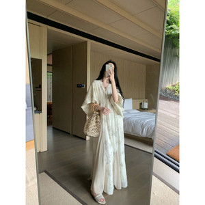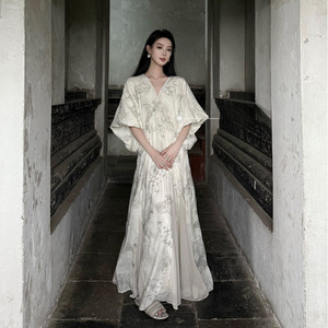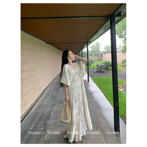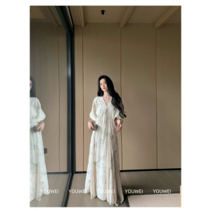 有洧Youwei巨好看的连衣裙女2025秋季款新中式禅意风长款V领裙子