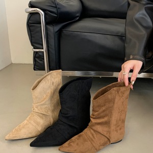 内增高堆堆短靴女鞋2025春秋季单靴尖头卡其色配裙子高跟瘦瘦靴子