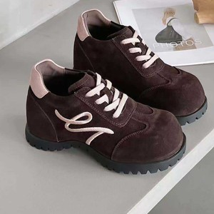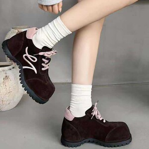 欧洲站女鞋25秋冬时尚撞色系带高丝光牛反绒皮圆头轻厚平底款单鞋