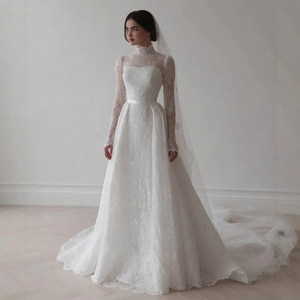 新娘婚纱蕾丝亮面高级感礼服2025新款长袖简约设计感欧美写真拍照
