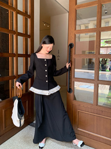 诠释美 NEWOPEN 25秋法式赫本风气质花边拼接单排扣方领外套F6099