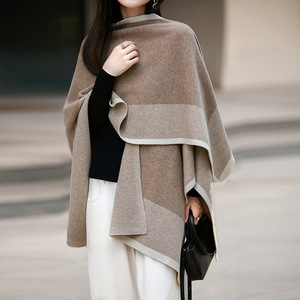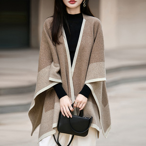 厂家跨境批发100%羊毛超大加厚披肩斗篷拼色针织保暖羊毛披肩现货