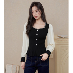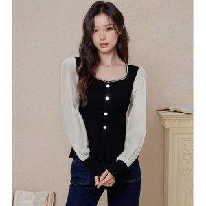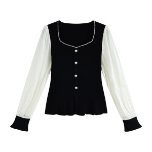 小香风方领长袖重工镶钻撞色针织衫女高级感气质减龄宽松显瘦上衣