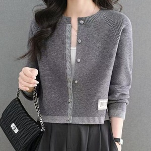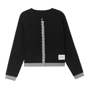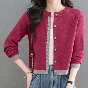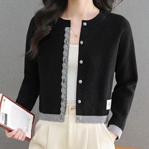 春秋新款圆领小个子短外套女士洋气蕾丝针织开衫拼色宽松上衣潮流