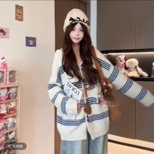 条纹连帽针织开衫毛衣女春秋冬季加厚宽松慵懒风外穿卫衣外套女装