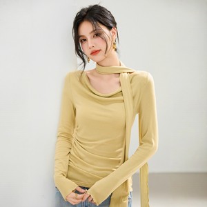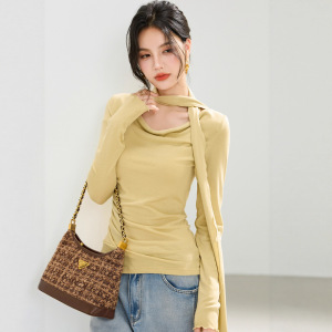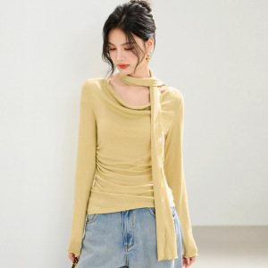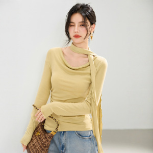 G1955秋冬新款女装跨境松弛立裁荡领挂脖针织T恤显白绿色上衣修身