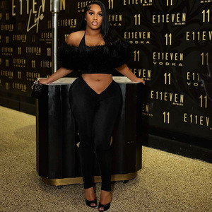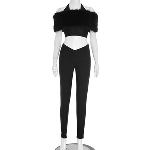 J25ST287 欧美跨境女秋冬挂脖绑带露肩皮草衣露脐缩褶V腰长裤套装