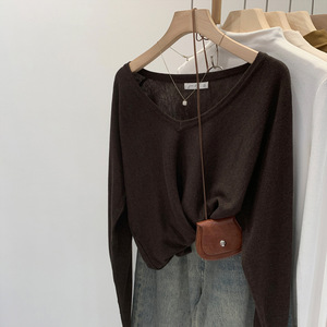 高级感好看咖色V领长袖针织衫女2025早秋新款修身内搭打底衫上衣