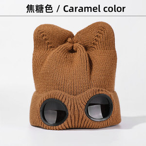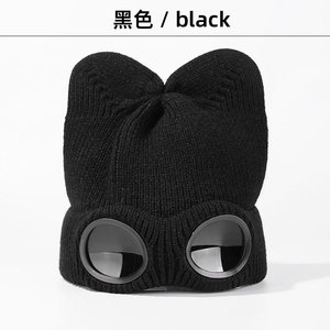 冬季新款时尚猫耳朵针织套头帽飞行员眼镜毛线帽加绒保暖护目冷帽