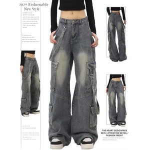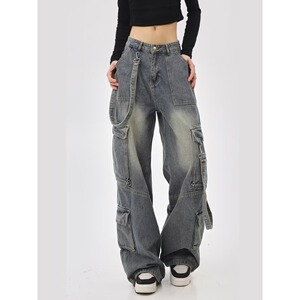外贸大码美式高街工装牛仔裤女新款多口袋直筒阔腿宽松拖地长裤子