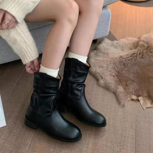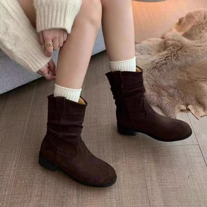 粗跟绒面堆堆靴马丁靴女靴子2025新款春秋季卡其色显瘦法式小短靴