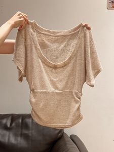 卡其色U型领薄款微透拼接褶皱短袖T恤2025夏季新款巨好看短上衣女