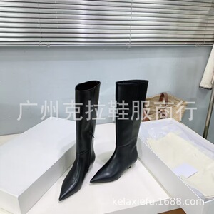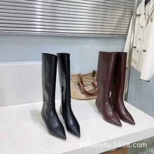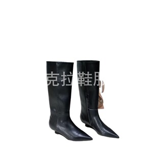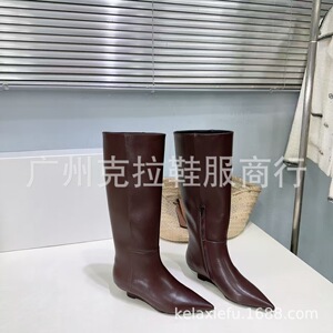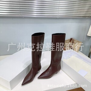 高定2025秋冬小众真皮尖头复古坡跟侧拉链高筒骑士靴不过膝长靴女
