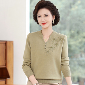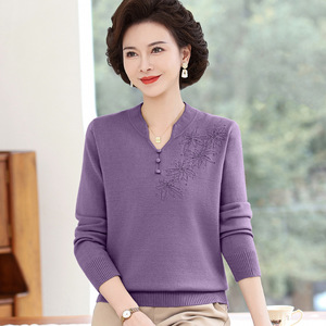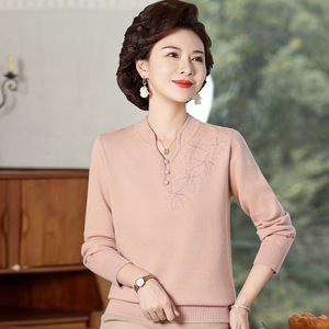 妈妈长袖t恤上衣春秋款洋气小衫50-60岁中老年大码女装针织打底衫