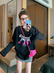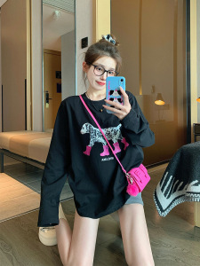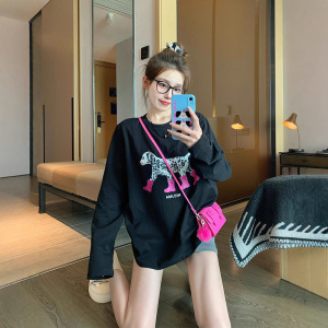胖mm卡通小狗大码长袖t恤女2025秋季宽松休闲美式复古内搭上衣ins